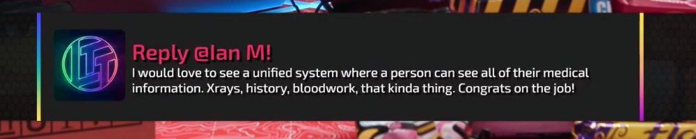 Reply @Ian M! I would love to see a unified system where a person can see all of their medical information. Xrays, history, bloodwork, that kinda thing. Congrats on the job!