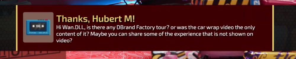 Thanks, Hubert M! Hi Wan.DLL, is there any DBrand Factory tour? or was the car wrap video the only content of it? Maybe you can share some of the experience that is not shown on video?
