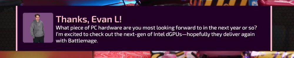 Thanks, Evan L! What piece of PC hardware are you most looking forward to in the next year or so? I'm excited to check out the next-gen of Intel dGPUS—hopefully they deliver again with Battlemage.