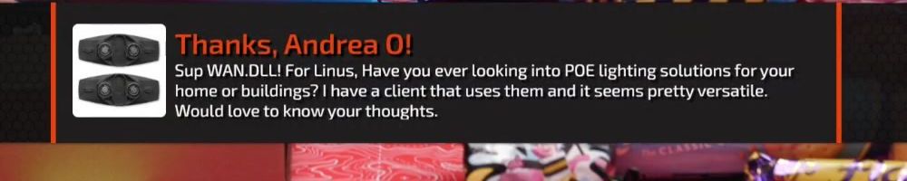 Thanks, Andrea O! Sup WAN.DLL! For Linus, Have you ever looking into POE lighting solutions for your home or buildings? I have a client that uses them and it seems pretty versatile. Would love to know your thoughts.