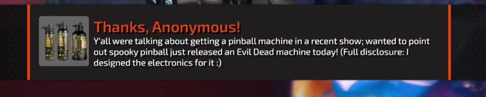 Thanks, Anonymous! Y'all were talking about getting a pinball machine in a recent show; wanted to point out spooky pinball just released an Evil Dead machine today! (Full disclosure: I designed the electronics for it :)