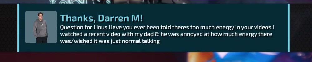 Thanks, Darren M! Question for Linus Have you ever been told theres too much energy in your videos | watched a recent video with my dad & he was annoyed at how much energy there was/wished it was just normal talking