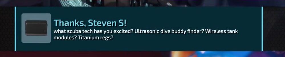 Thanks, Steven S! what scuba tech has you excited? Ultrasonic dive buddy finder? Wireless tank modules? Titanium regs?