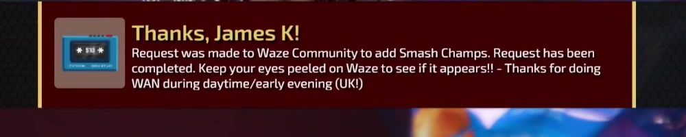 Thanks, James K! Request was made to Waze Community to add Smash Champs. Request has been completed. Keep your eyes peeled on Waze to see if it appears!! - Thanks for doing WAN during daytime/early evening (UK!)