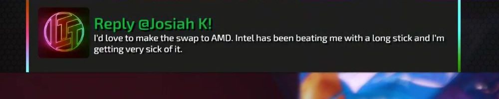 Reply @Josiah K! I'd love to make the swap to AMD. Intel has been beating me with a long stick and I'm getting very sick of it.