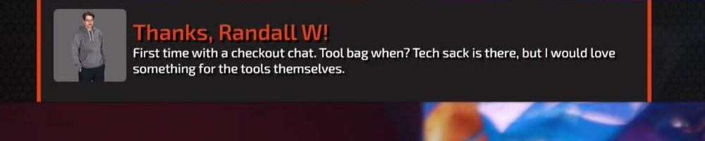 Thanks, Randall W! First time with a checkout chat. Tool bag when? Tech sack is there, but I would love something for the tools themselves.