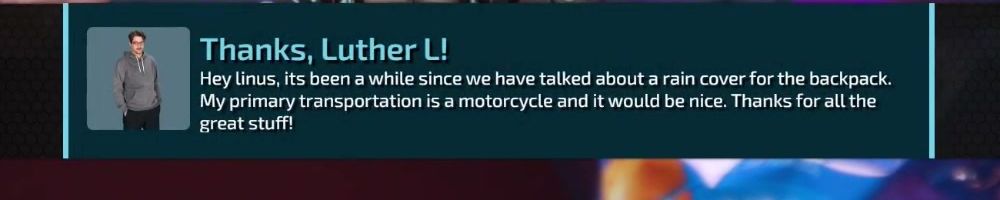 Thanks, Luther L! Hey linus, its been a while since we have talked about a rain cover for the backpack. My primary transportation is a motorcycle and it would be nice. Thanks for all the great stuff!