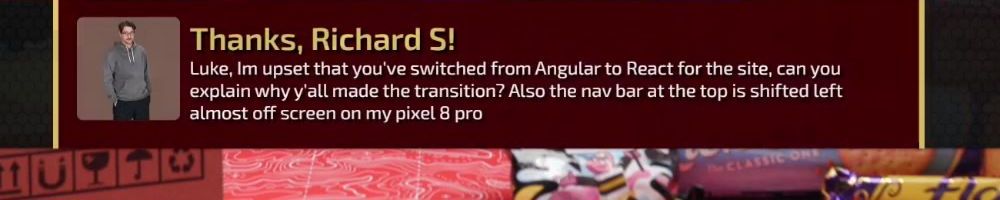 Thanks, Richard S! Luke, Im upset that you've switched from Angular to React for the site, can you explain why y'all made the transition? Also the nav bar at the top is shifted left almost off screen on my pixel 8 pro