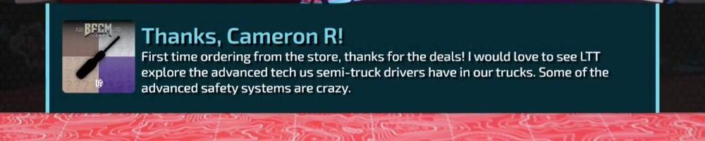 First time ordering from the store, thanks for the deals! I would love to see LTT explore the advanced tech us semi-truck drivers have in our trucks. Some of the advanced safety systems are crazy.