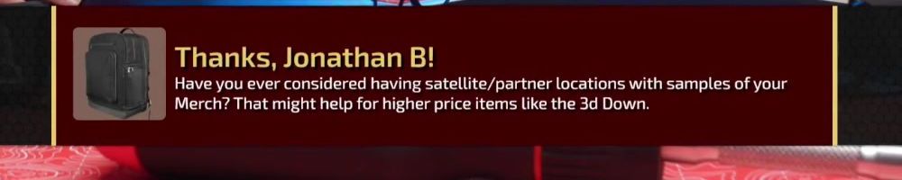Have you ever considered having satellite/partner locations with samples of your Merch? That might help for higher price items like the 3d Down.