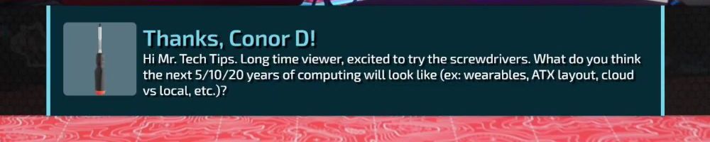 Hi Mr. Tech Tips. Long time viewer, excited to try the screwdrivers. What do you think the next 5/10/20 years of computing will look like (ex: wearables, ATX layout, cloud vs local, etc.)?