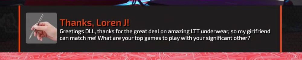 Greetings DLL, thanks for the great deal on amazing LTT underwear, so my girlfriend can match me! What are your top games to play with your significant other?