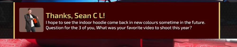 I hope to see the indoor hoodie come back in new colours sometime in the future. Question for the 3 of you, What was your favorite video to shoot this year?
