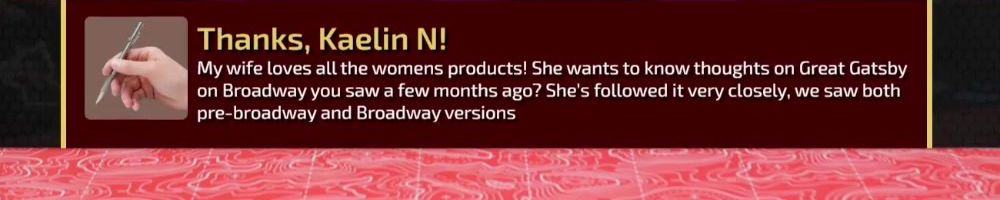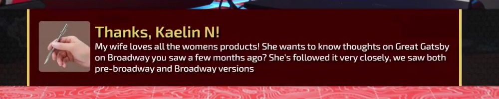 My wife loves all the womens products! She wants to know thoughts on Great Gatsby on Broadway you saw a few months ago? She's followed it very closely, we saw both pre-broadway and Broadway versions