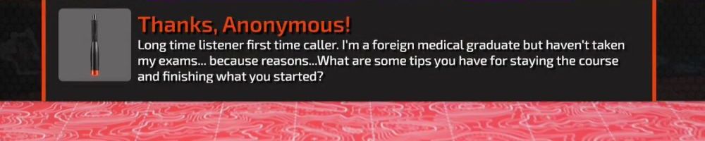 Long time listener first time caller. I'm a foreign medical graduate but haven't taken my exams... because reasons... What are some tips you have for staying the course and finishing what you started?