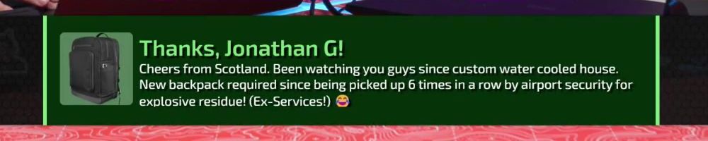 Cheers from Scotland. Been watching you guys since custom water cooled house. New backpack required since being picked up 6 times in a row by airport security for explosive residue! (Ex-Services!) 😂