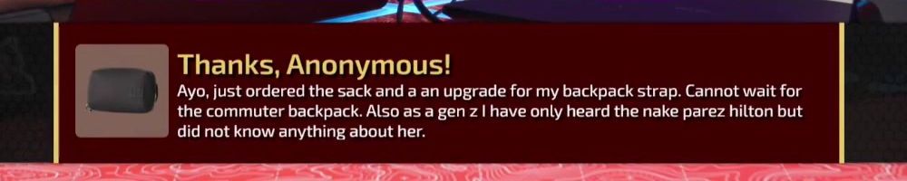 Ayo, just ordered the sack and a an upgrade for my backpack strap. Cannot wait for the commuter backpack. Also as a gen z I have only heard the nake parez hilton but did not know anything about her.