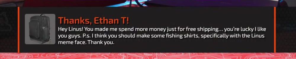 Hey Linus! You made me spend more money just for free shipping... you're lucky I like you guys. P.s. I think you should make some fishing shirts, specifically with the Linus meme face. Thank you.