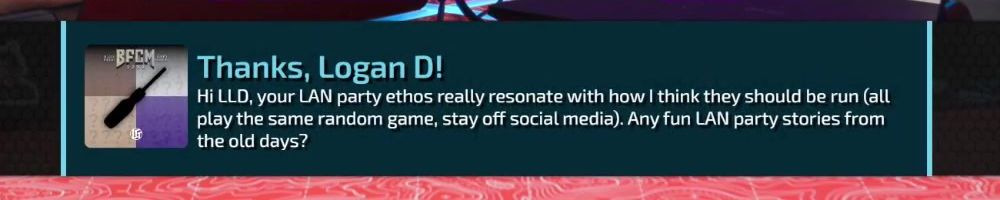 Hi LLD, your LAN party ethos really resonate with how I think they should be run (all play the same random game, stay off social media). Any fun LAN party stories from the old days?