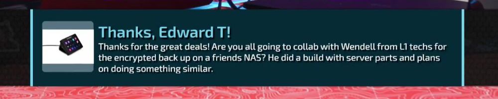 Thanks for the great deals! Are you all going to collab with Wendell from L1 techs for the encrypted back up on a friends NAS? He did a build with server parts and plans on doing something similar.