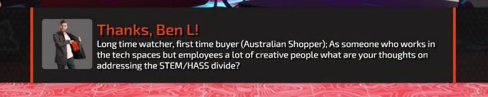 Long time watcher, first time buyer (Australian Shopper); As someone who works in the tech spaces but employs a lot of creative people what are your thoughts on addressing the STEM/HASS divide?