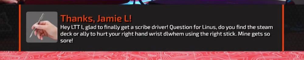 Hey LTT, glad to finally get a scribe driver! Question for Linus, do you find the steam deck or ally to hurt your right hand wrist diwhem using the right stick. Mine gets so sore!