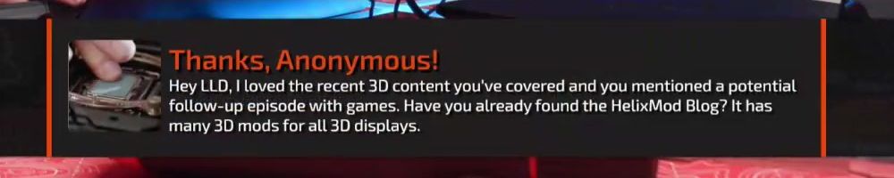 Hey LLD, I loved the recent 3D content you've covered and you mentioned a potential follow-up episode with games. Have you already found the HelixMod Blog? It has many 3D mods for all 3D displays.