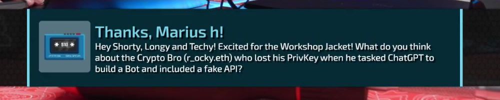 Hey Shorty, Longy and Techy! Excited for the Workshop Jacket! What do you think about the Crypto Bro (r_ocky.eth) who lost his PrivKey when he tasked ChatGPT to build a Bot and included a fake API?