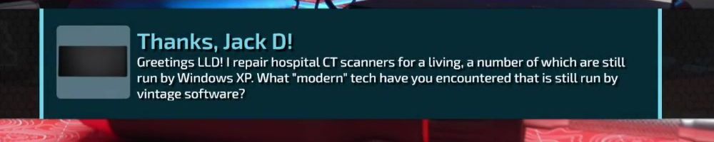 Greetings LLD! I repair hospital CT scanners for a living, a number of which are still run by Windows XP. What "modern" tech have you encountered that is still run by vintage software?