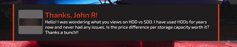 Hello! I was wondering what you views on HDD vs SDD. I have used HDDs for years now and never had any issues. Is the price difference per storage capacity worth it? Thanks a bunch!!