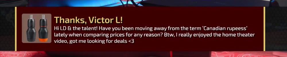 Hi LD & the talent! Have you been moving away from the term 'Canadian rupeess' lately when comparing prices for any reason? Btw, I really enjoyed the home theater video, got me looking for deals <3