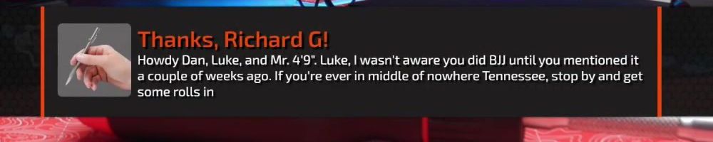 Howdy Dan, Luke, and Mr. 4'9". Luke, I wasn't aware you did BJJ until you mentioned it a couple of weeks ago. If you're ever in middle of nowhere Tennessee, stop by and get some rolls in