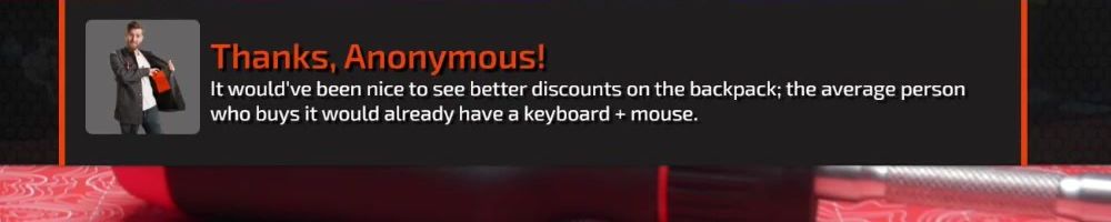 It would've been nice to see better discounts on the backpack; the average person who buys it would already have a keyboard + mouse.