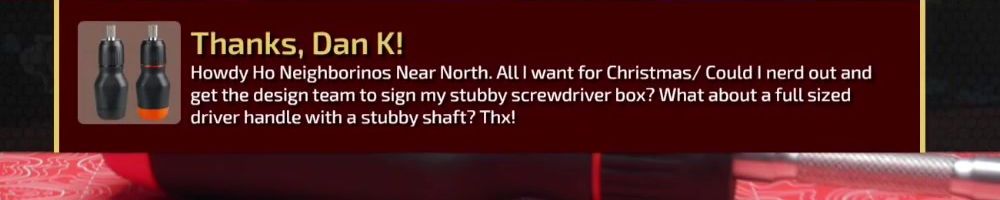 Howdy Ho Neighborinos Near North. All I want for Christmas/ Could I nerd out and get the design team to sign my stubby screwdriver box? What about a full sized driver handle with a stubby shaft? Thx!