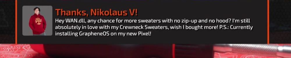 Hey WAN.dlL, any chance for more sweaters with no zip-up and no hood? I'm still absolutely in love with my Crewneck Sweaters, wish I bought more! P.S.: Currently installing GrapheneOS on my new Pixel!