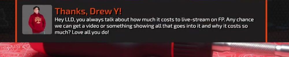 Hey LLD, you always talk about how much it costs to live-stream on FP. Any chance we can get a video or something showing all that goes into it and why it costs so much? Love all you do!
