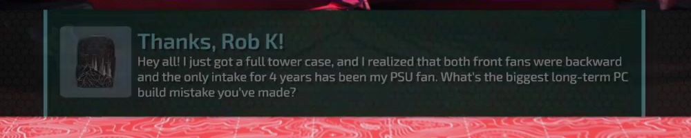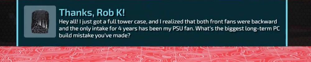 Hey all! I just got a full tower case, and I realized that both front fans were backward and the only intake for 4 years has been my PSU fan. What's the biggest long-term PC build mistake you've made?
