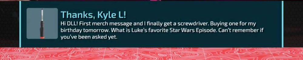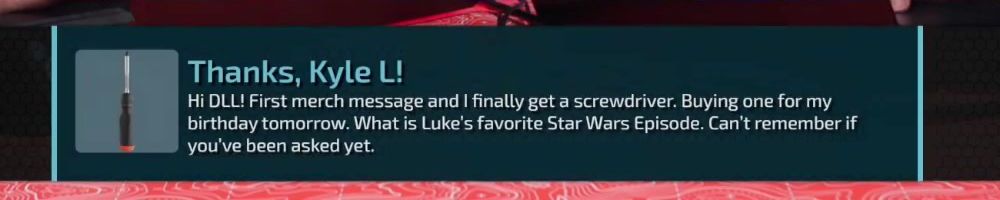 Hi DLL! First merch message and I finally get a screwdriver. Buying one for my birthday tomorrow. What is Luke's favorite Star Wars Episode. Can't remember if you've been asked yet.