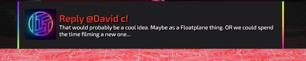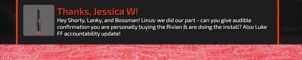 Hey Shorty, Lanky, and Bossman! Linus: we did our part - can you give audible confirmation you are personally buying the Rivian & are doing the install? Also Luke FF accountability update!
