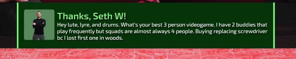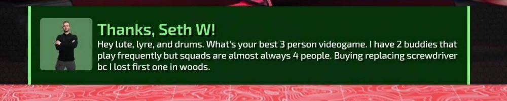 Hey lute, lyre, and drums. What's your best 3 person videogame. I have 2 buddies that play frequently but squads are almost always 4 people. Buying replacing screwdriver bc I lost first one in woods.