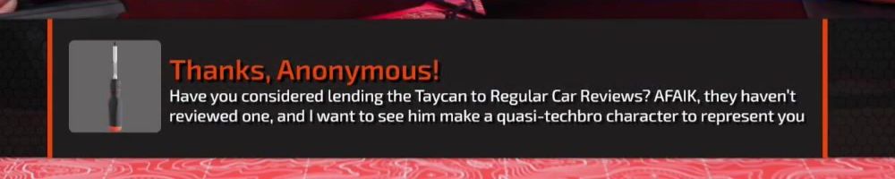 Have you considered lending the Taycan to Regular Car Reviews? AFAIK, they haven't reviewed one, and I want to see him make a quasi-techbro character to represent you