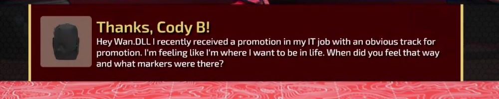 Hey Wan.DLL I recently received a promotion in my IT job with an obvious track for promotion. I'm feeling like I'm where I want to be in life. When did you feel that way and what markers were there?
