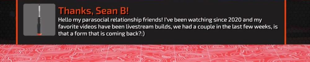 Hello my parasocial relationship friends! I've been watching since 2020 and my favorite videos have been livestream builds, we had a couple in the last few weeks, is that a form that is coming back?)