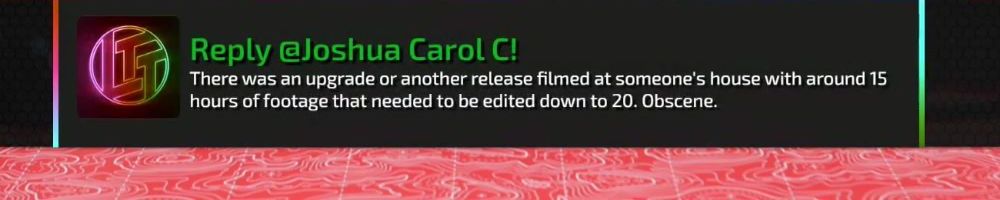 There was an upgrade or another release filmed at someone's house with around 15 hours of footage that needed to be edited down to 20. Obscene.