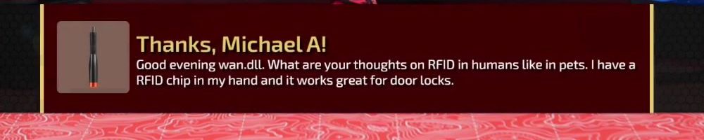 Good evening wan.dll. What are your thoughts on RFID in humans like in pets. I have a RFID chip in my hand and it works great for door locks.