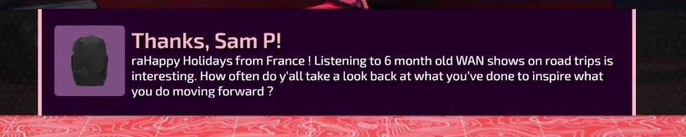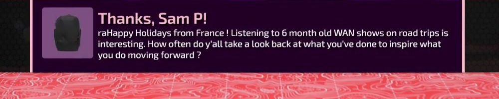 raHappy Holidays from France ! Listening to 6 month old WAN shows on road trips is interesting. How often do y'all take a look back at what you've done to inspire what you do moving forward ?