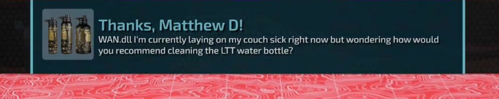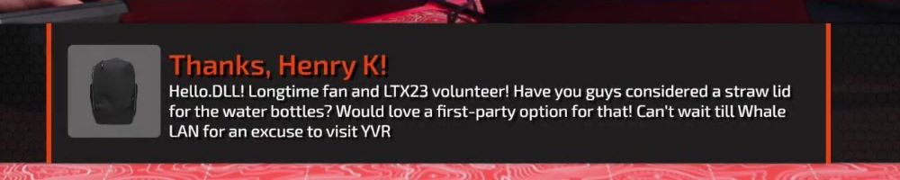 Hello.DLL! Longtime fan and LTX23 volunteer! Have you guys considered a straw lid for the water bottles? Would love a first-party option for that! Can't wait till Whale LAN for an excuse to visit YVR