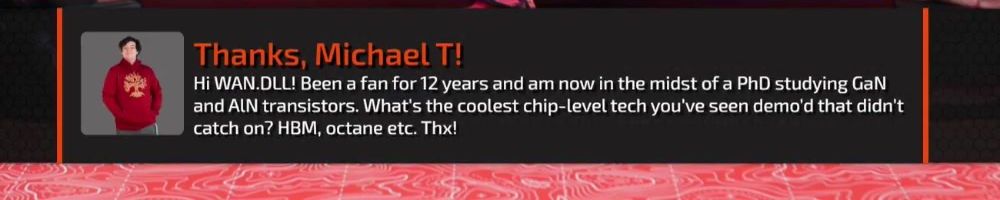 Hi WAN.DLL! Been a fan for 12 years and am now in the midst of a PhD studying GaN and AlN transistors. What's the coolest chip-level tech you've seen dema'd that didn't catch on? HBM, octane etc. Thx!