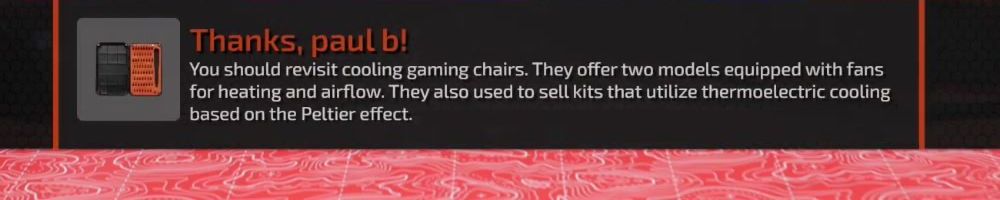 You should revisit cooling gaming chairs. They offer two models equipped with fans for heating and airflow. They also used to sell kits that utilize thermoelectric cooling based on the Peltier effect.