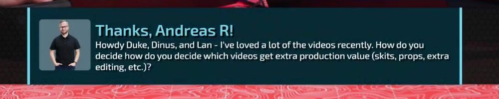 Howdy Duke, Dinus, and Lan - I've loved a lot of the videos recently. How do you decide how do you decide which videos get extra production value (skits, props, extra editing, etc.)?